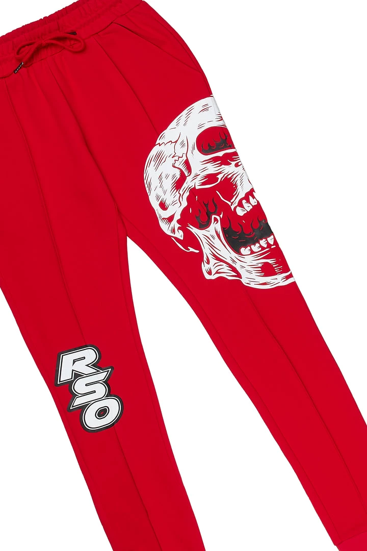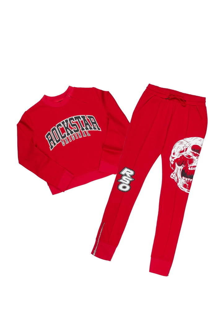 Rockstar Original Women’s two-piece tracksuit set in red. Featuring printed RSO logos throughout the top and bottoms. Top accents a mini crewneck length while the bottoms accent a skull graphic with a drawstring waistband, side pockets and high quality ankle zipper hems.