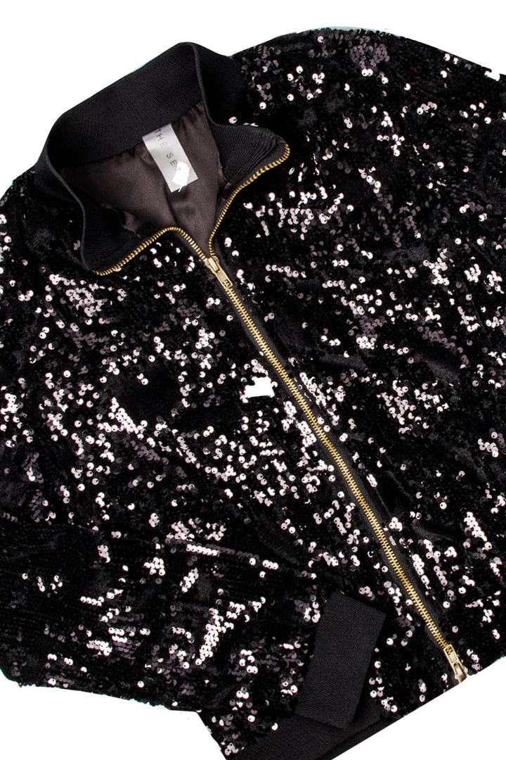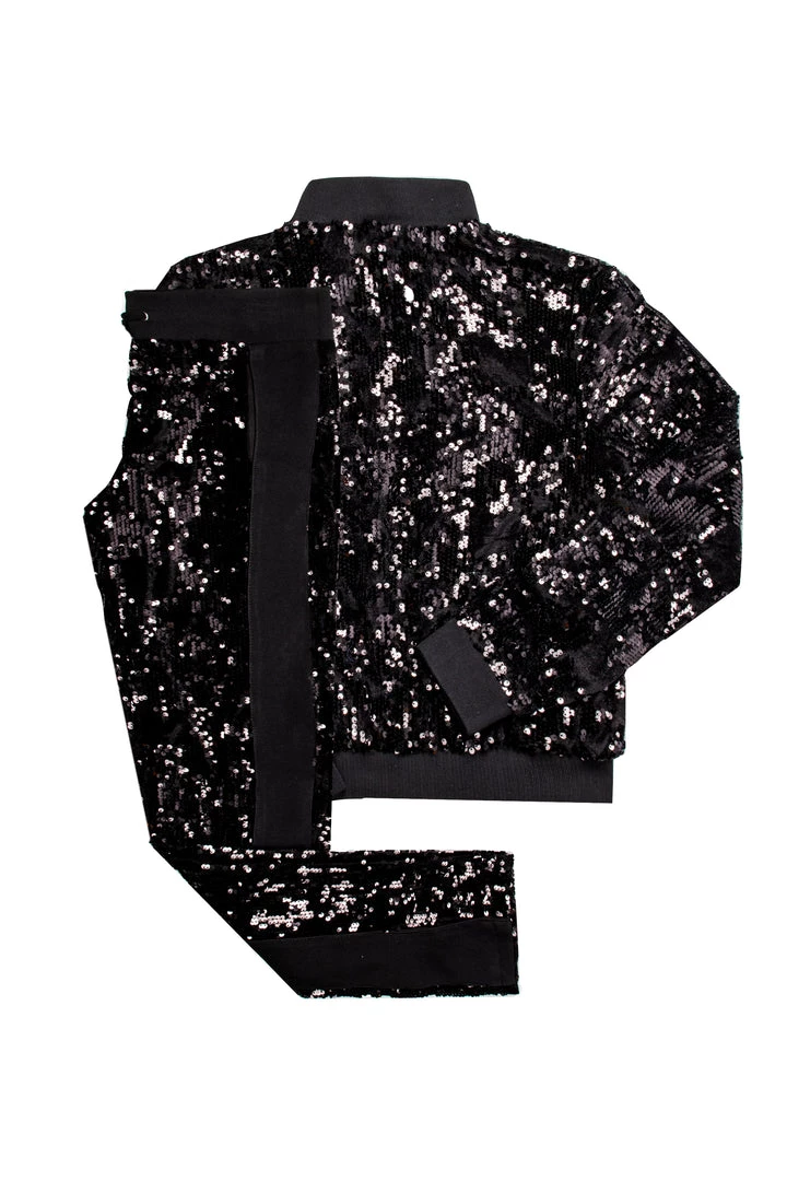 Rockstar Original Women’s tracksuit set in shimmering black. Featuring sparkling sequin designing throughout. This gorgeous two-piece set accents a high quality front zipper closure and cuffed hems on the top and a drawstring waistband with soft stripe accents on the bottoms. The ultimate triple threat ensemble — fitted, flexible and fierce!