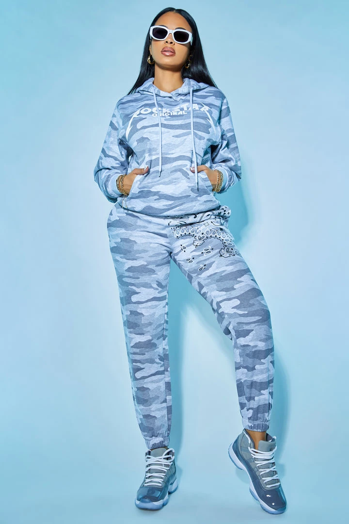 Rockstar Original Women’s two-piece tracksuit set in soft grey camo. Featuring classic RSO logos throughout with bandana prints. Top accents a drawstring hood, front pockets and elastic cuffs. Bottoms accent side pockets with a elastic waistband, elastic cuffs and premium cotton threading for style and comfort.
