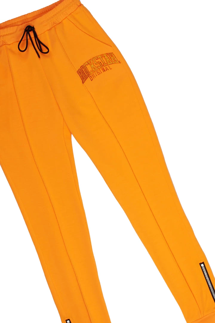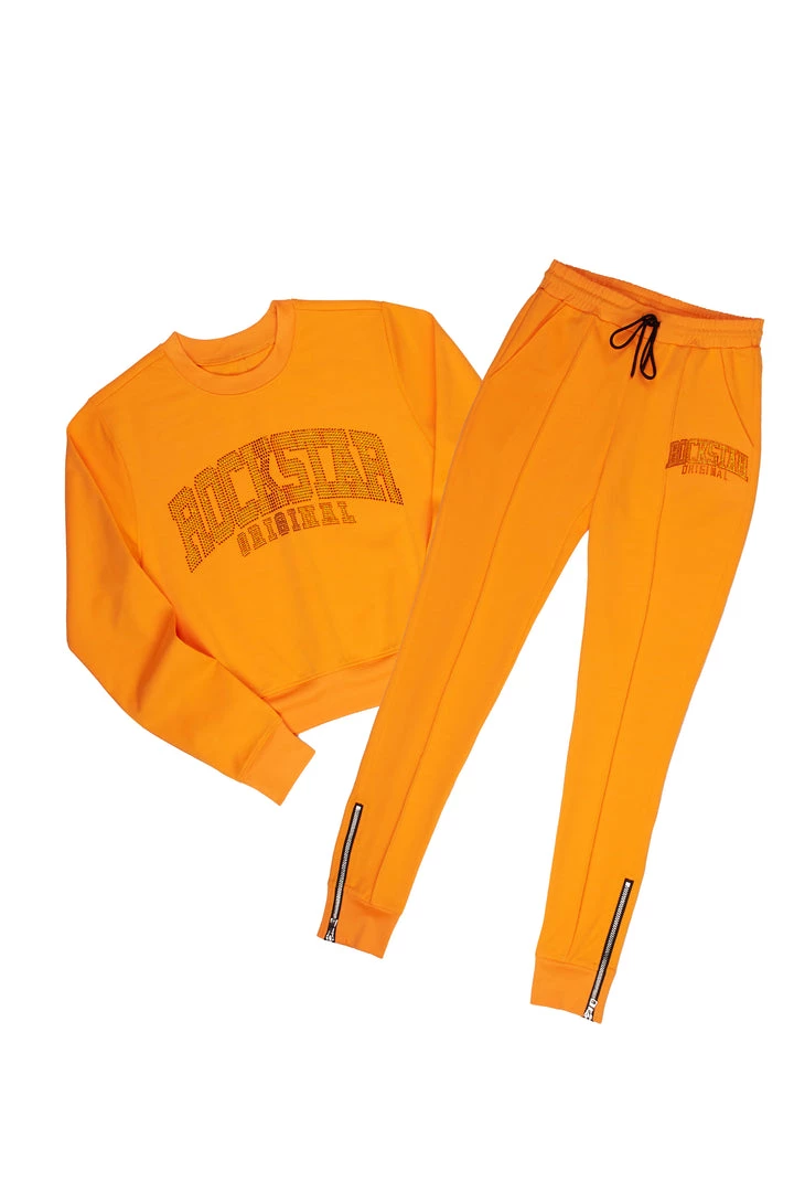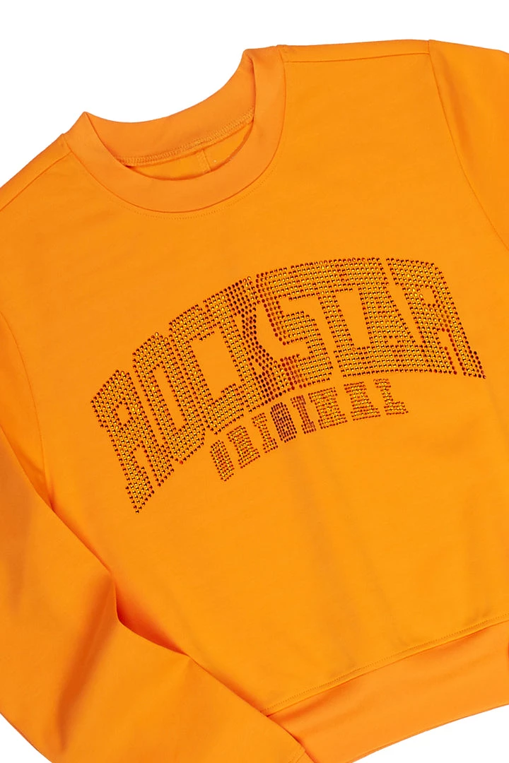 Rockstar Original Women’s two-piece tracksuit set in orange. Featuring rhinestone RSO logos on the top and bottoms. Top accents a crewneck design with a cropped length while the bottoms accent a drawstring waistband, side pockets and high quality ankle zipper hems.