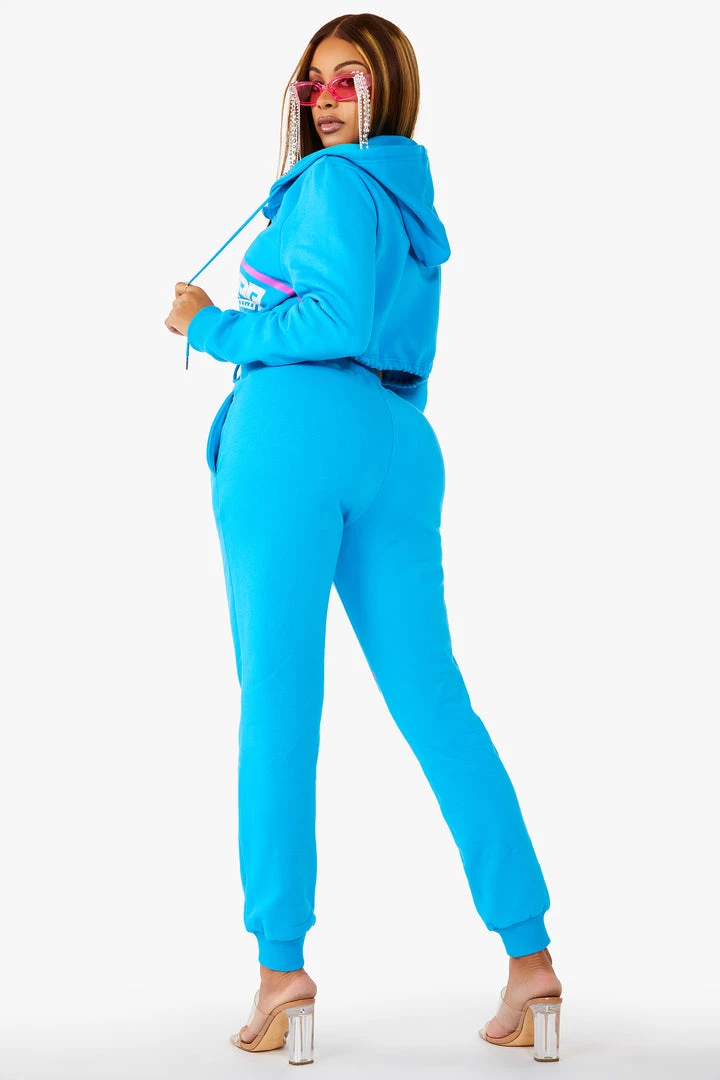 Rubi Rose x Rockstar Original Women’s two-piece crop top tracksuit set in too turnt turquoise. Featuring printed RSO logos on the top and bottoms with a stripe designing on the pant. Stay fitted and fashion-forward with this set that accents a drawstring hood and hem, high quality zipper closure, fitted waistband and pockets for comfort and convenience.