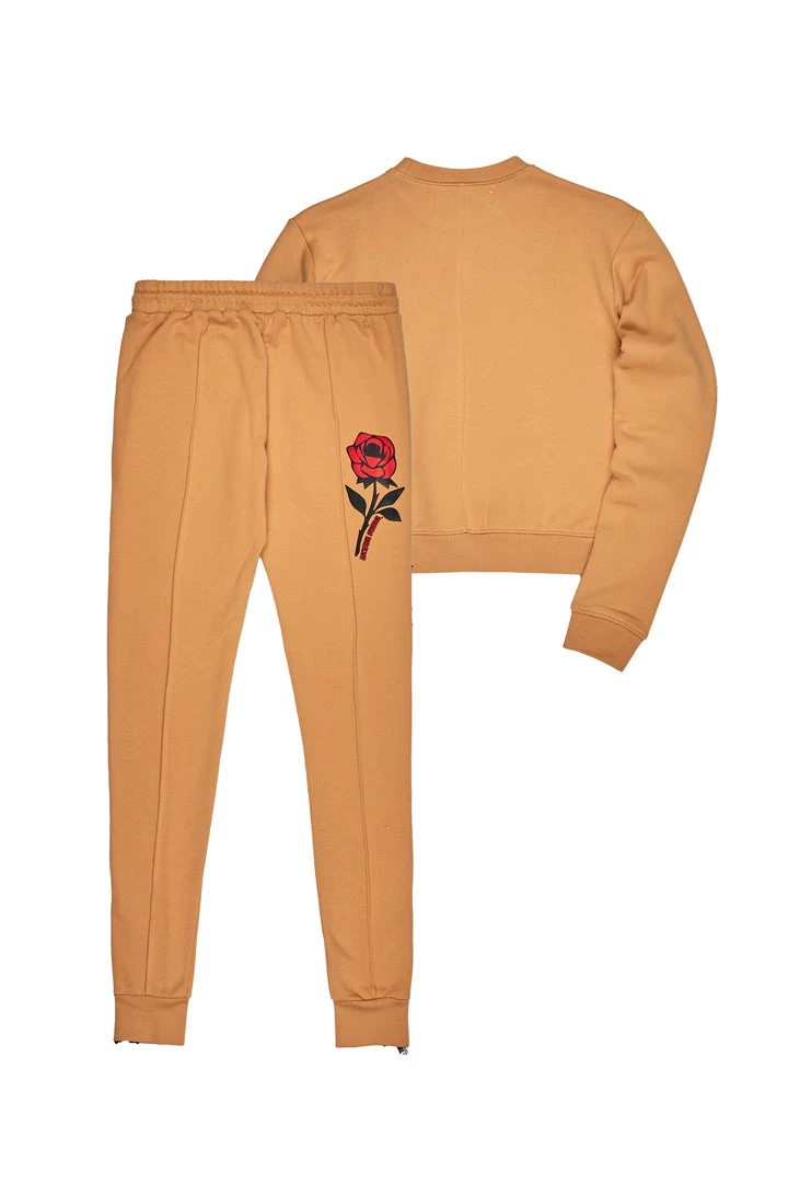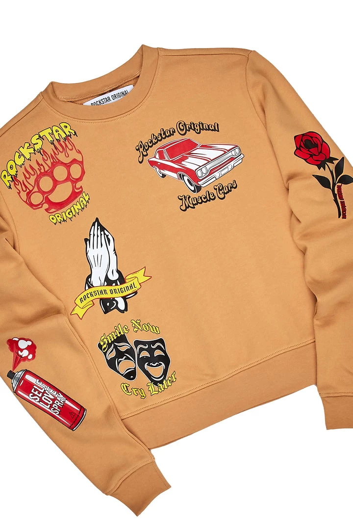 Rockstar Original Women’s two-piece tracksuit set in tan. Featuring printed RSO logos with custom graphics throughout. Top accents a crop length crewneck design with cuffed hems while bottoms accent side pockets, a drawstring waistband and zipper hems. Designed with premium cotton for all day comfort and style.