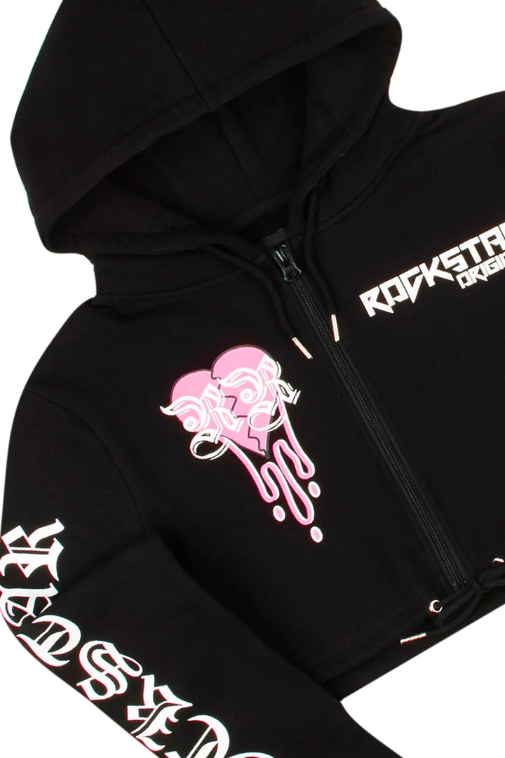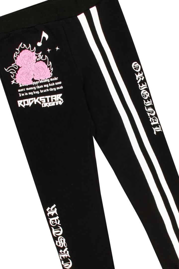 Rockstar Original Women’s two-piece crop top tracksuit set in black. Featuring printed RSO logos with graphics throughout and racer stripe designing on the pant. Stay fitted and fashion-forward with this set that accents a drawstring hood and hem, high quality front zipper closure, fitted waistband and pockets for comfort and convenience.