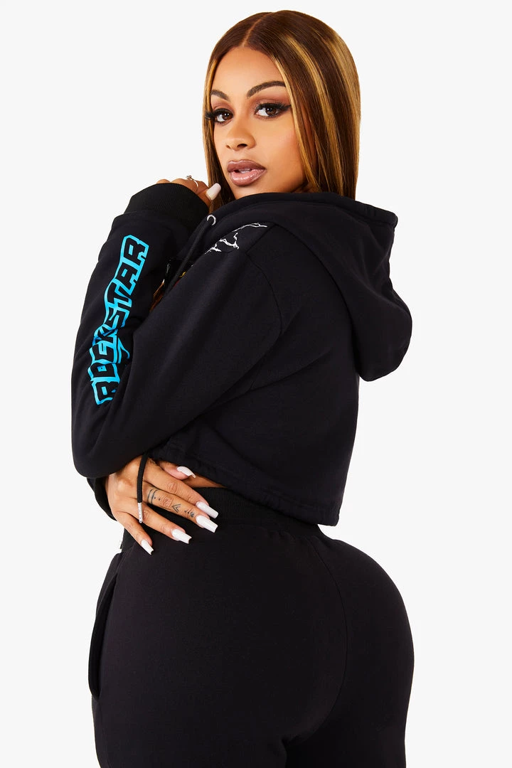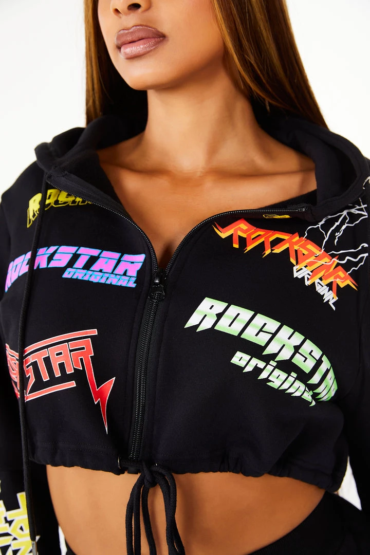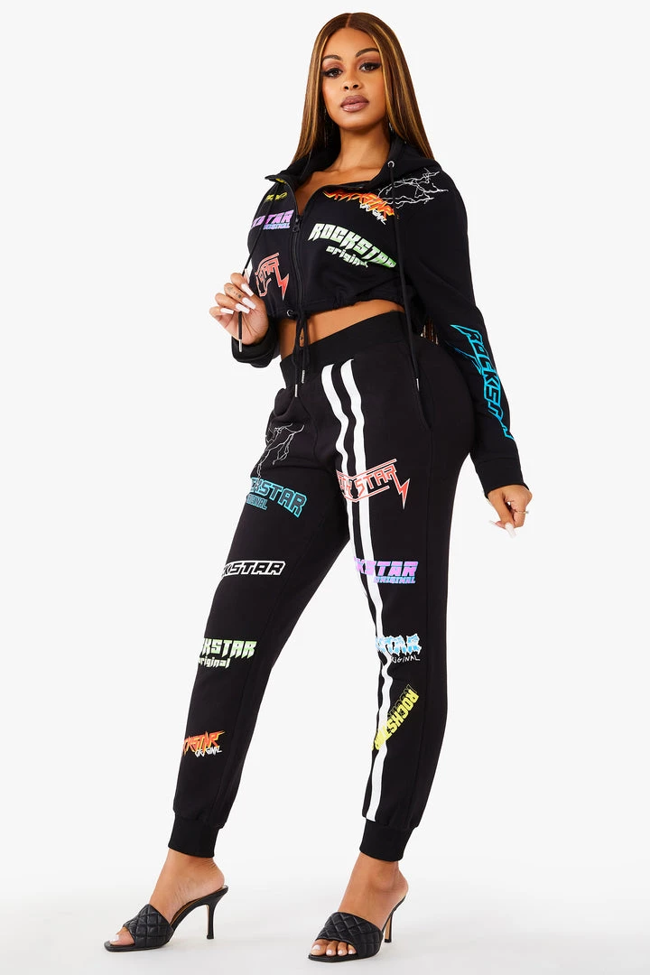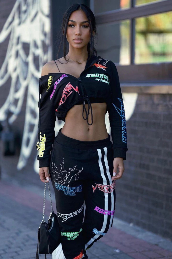 Rubi Rose x Rockstar Original Women’s two-piece crop top tracksuit set in chicest black. Featuring printed multi color RSO logos throughout with a stripe designing on the pant. Stay fitted and fashion-forward with this set that accents a drawstring hood and hem, high quality zipper closure, fitted waistband and pockets for comfort and convenience.